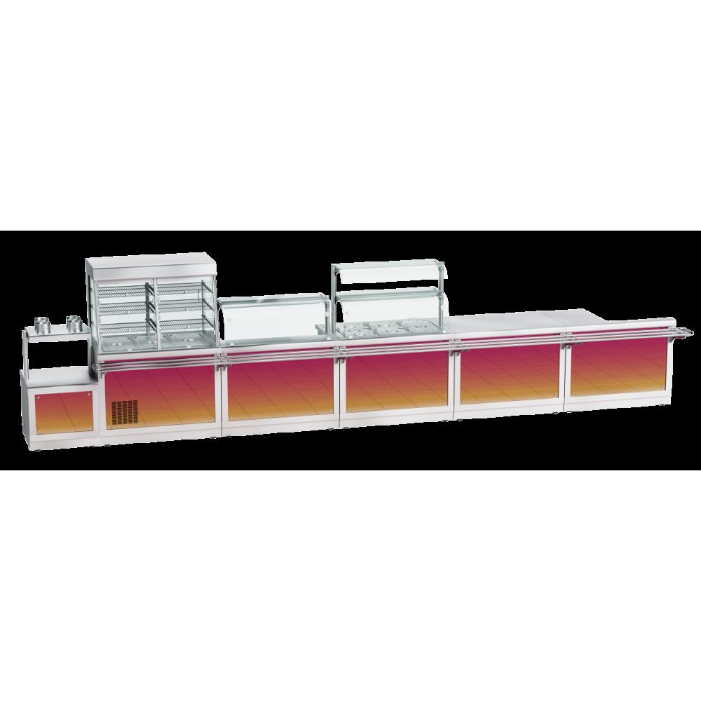 Прилавок для горячих напитков предназначен для кратковременного хранения и раздачи потребителю хлебобулочных и кондитерских изделий, а также для установки на его столе термостата и кипятильника. ВНИМАНИЕ: Линия раздачи "HOT-LINE" изготавливается по заказу с панелями только из нержавеющей стали! Дополнительно можно приобрести комплект торцевого и комплект колес.- 2 розетки на 16 А,